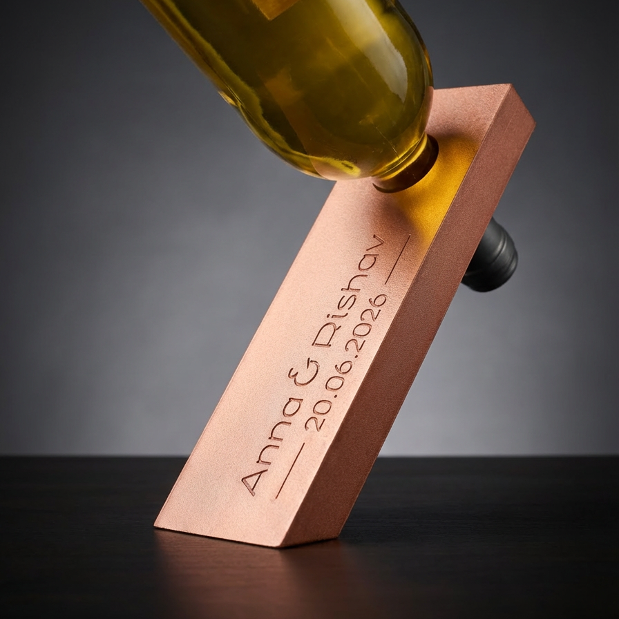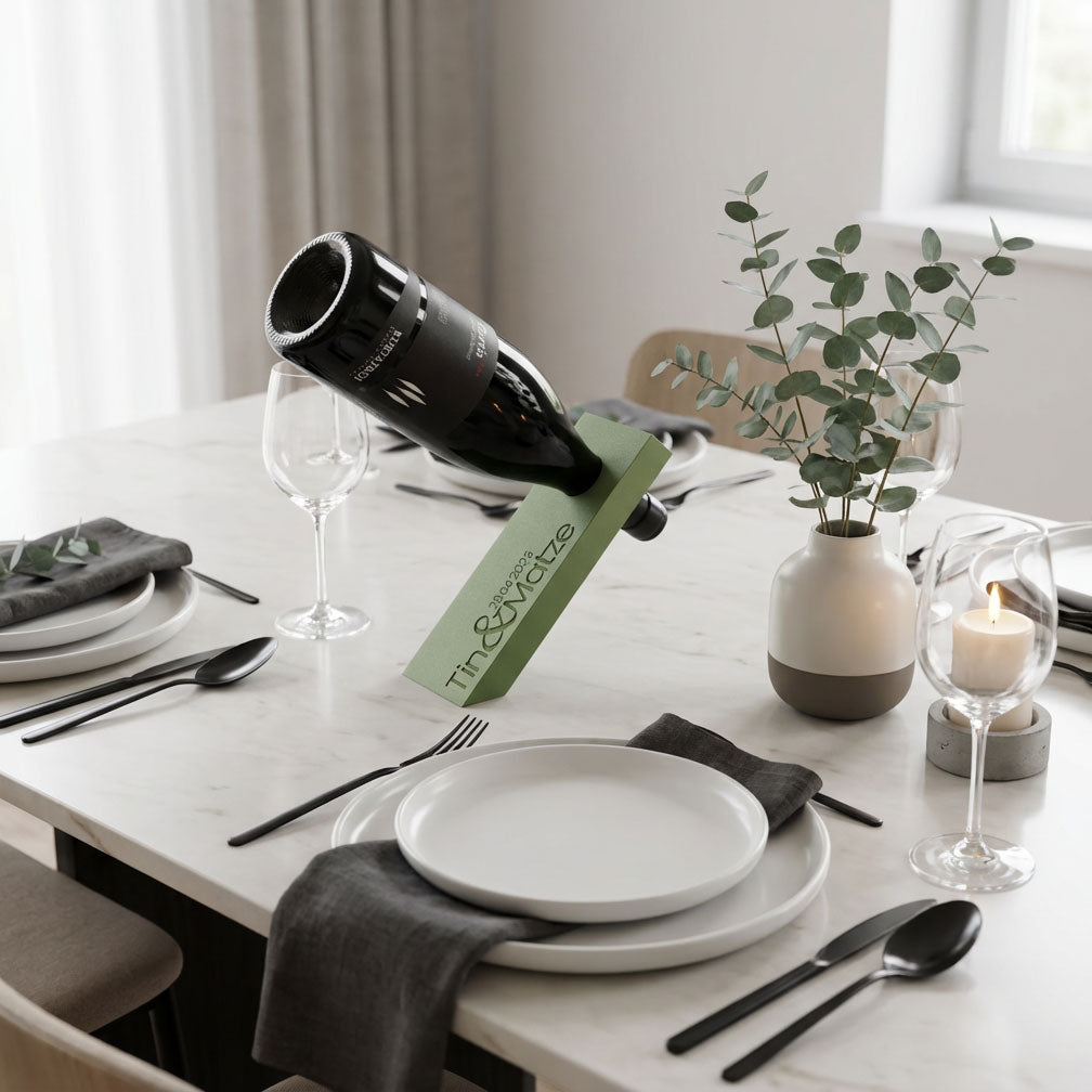 Der BALANCEAKT ist kein gewöhnlicher Flaschenhalter. Er bringt nicht nur deine Weinflasche ins Gleichgewicht, sondern auch deine persönliche Botschaft auf den Tisch. Der Clou? Die schräge Position der Flasche sorgt für echtes Staunen – ganz ohne sichtbare Stütze. Und vorne trägt der Block genau das, was dir wichtig ist: Dein Wunschtext, ein frecher Spruch oder dein Firmenlogo.